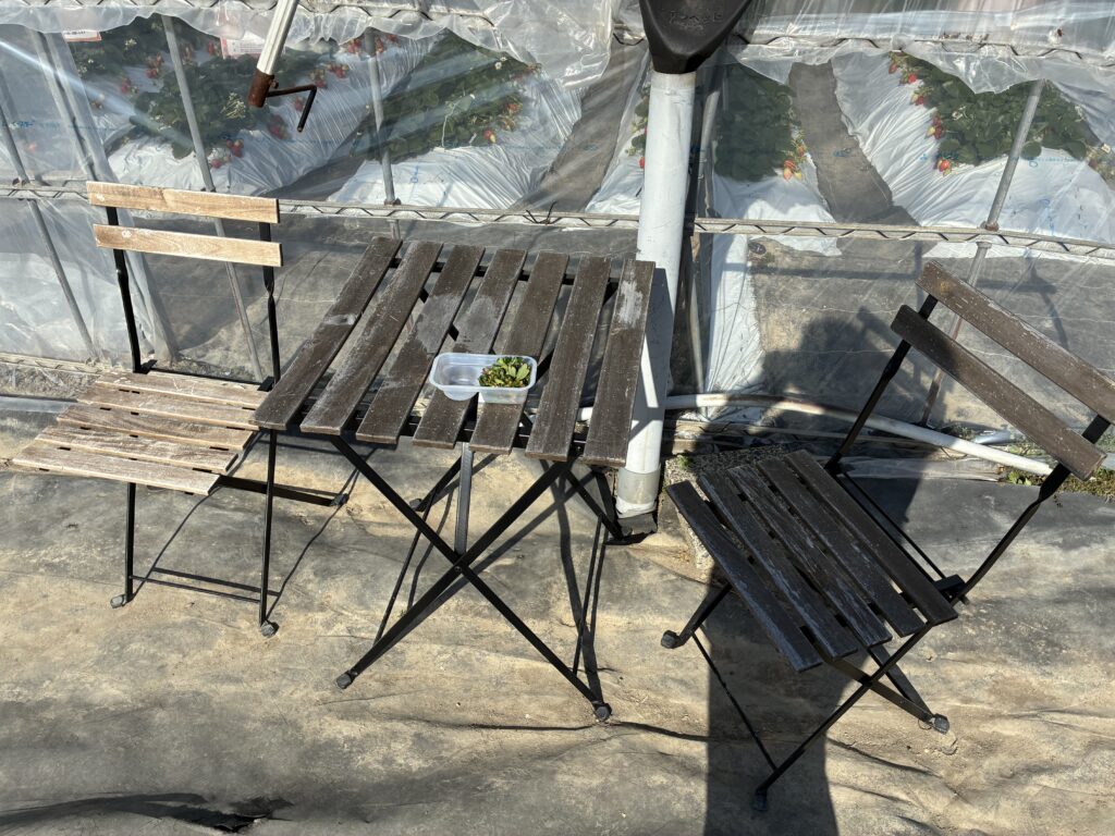 ハウスの外には椅子とテーブルがあり、沢山とってそこでゆっくり食べる人も多かったです。