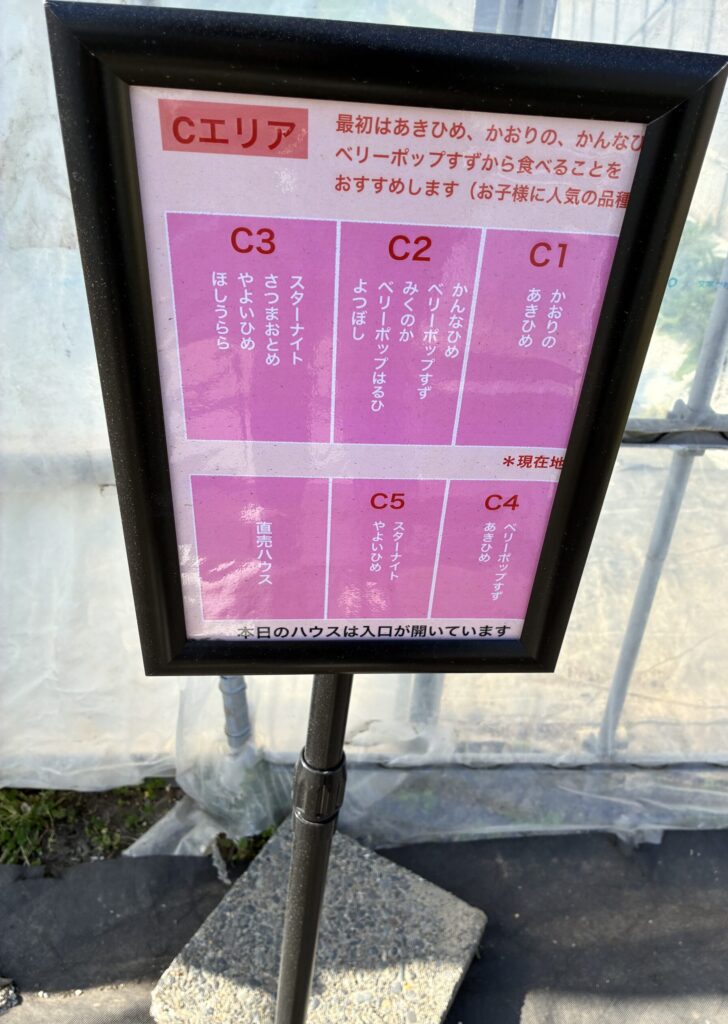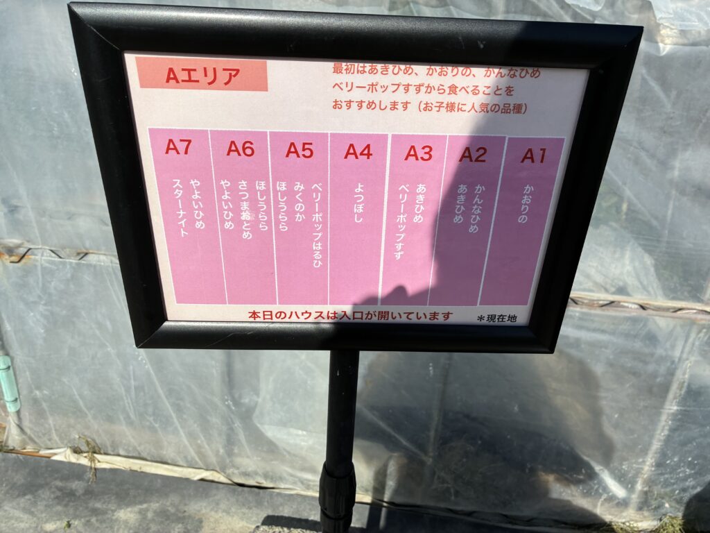 ハウスの前にどの場所になんの品種があるか案内があります。